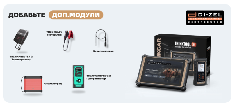 Cовместим с THINKCAR-аксессуарами, включая тестер аккумуляторов, осциллограф, видеоэндоскоп, TPMS-инструменты, программатор ключей PROG и систему калибровки ADAS.