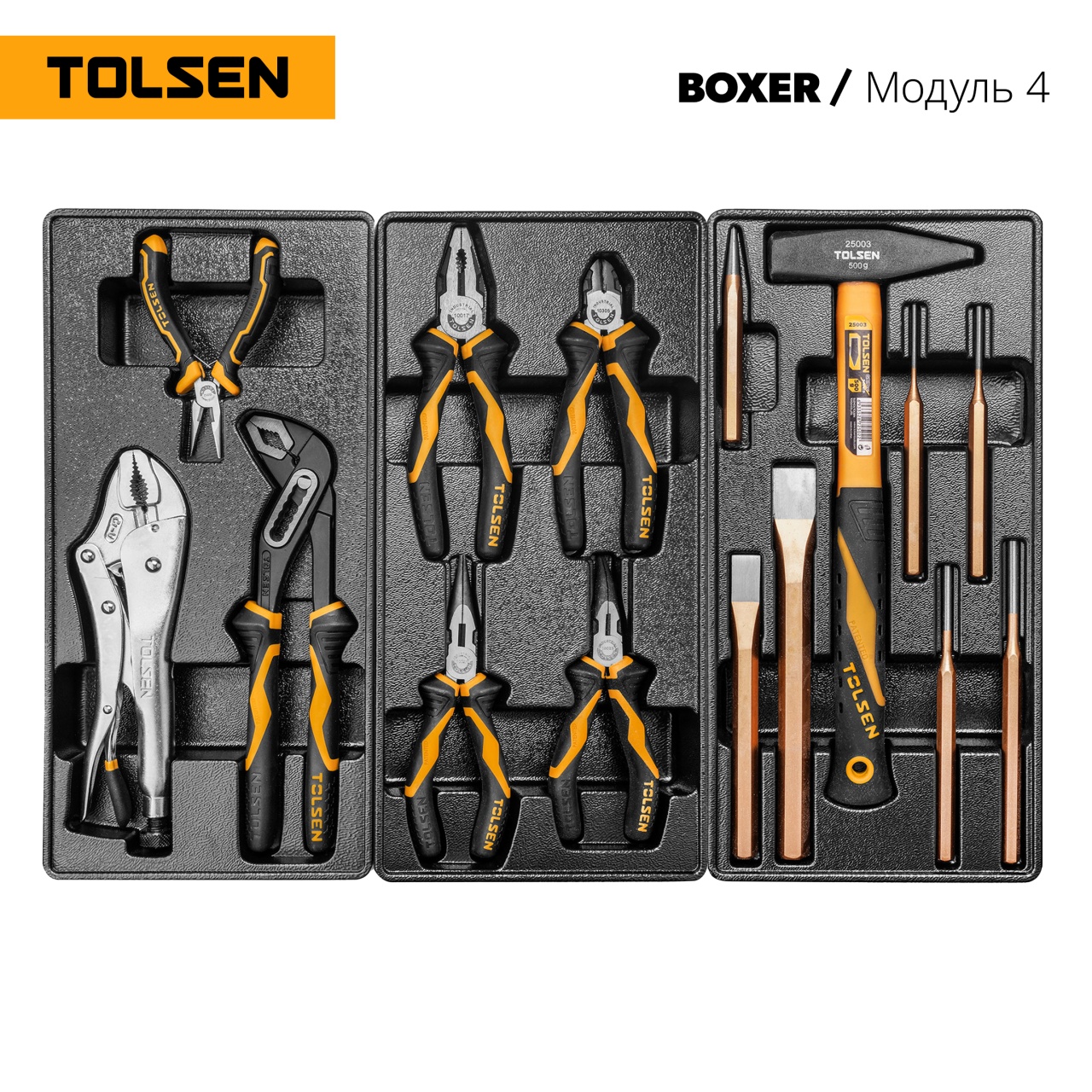 Материалы – инструментальные стали Cr-V, Cr-Mo, SNCM+V (S2), конструкционная сталь, хром, пластики PP, вспененный PVC, PP+TPR (рукояти отвёрток, трещоток, шарнирно-губцевого инструмента), дерево (рукоять молотка), PVC (ложементы)
