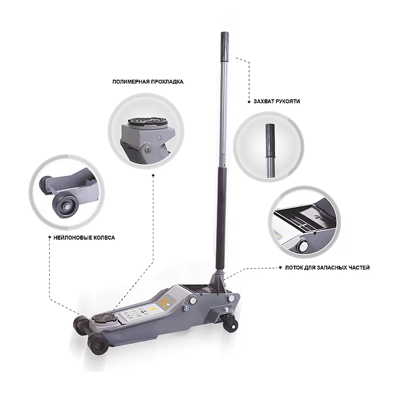 Эргономичная самовозвратная ручка с мягкой отделкой предохраняет автомобиль от повреждений. Ручка позволяет просто и легко управлять домкратом. Удобный лоток для инструмента, запасных частей, гаек и болтов. Бесшумные высокопрочные нейлоновые колеса отличаются высокой маневренностью в условиях ограниченного пространства, не повреждают пол и не ржавеют.