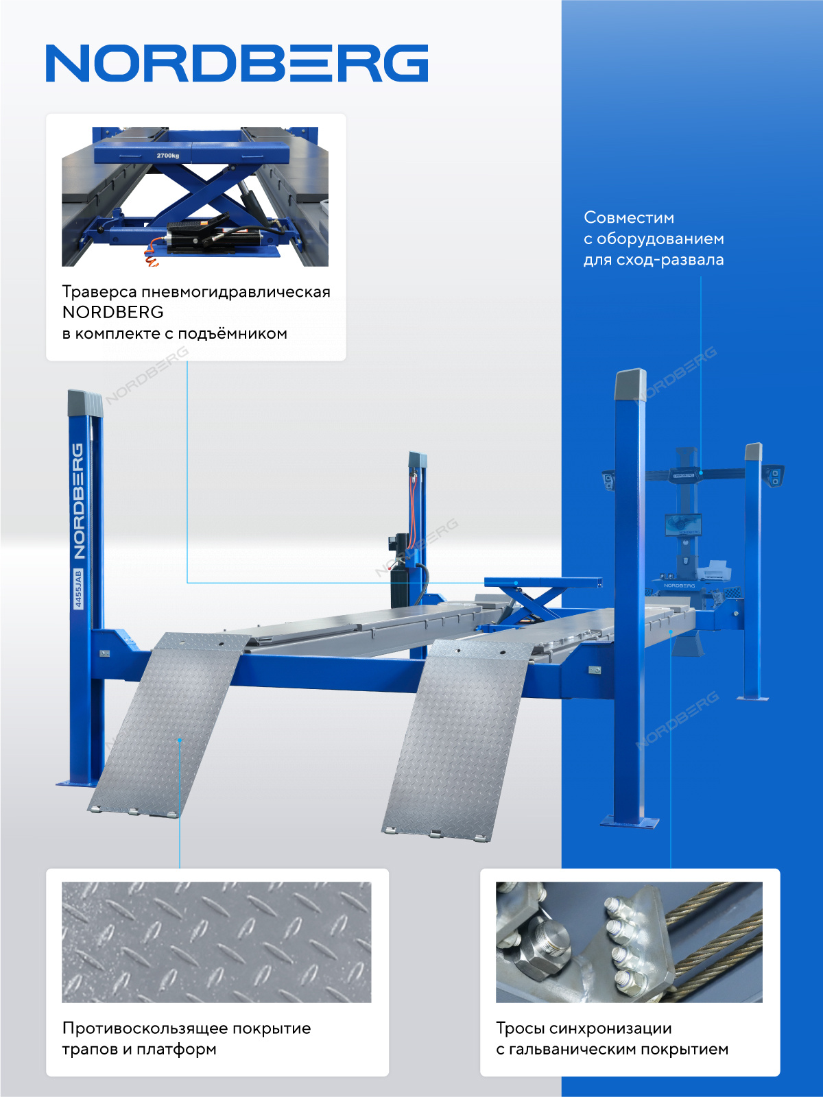 Подъемник четырехстоечный 5.5 т, с пневмогидравлической траверсой 2.7 т, для сход-развала, 380В NORDBERG 4455JAB синий