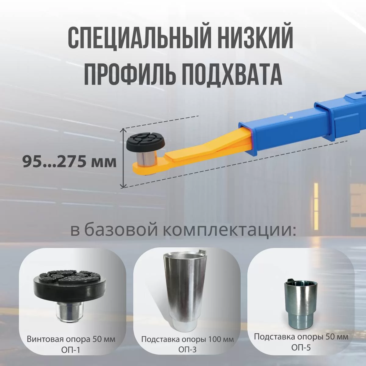 Подъемник оснащен двумя комплектами подставок 50 и 100 мм. Вы можете использовать их в любой комбинации, обеспечив высоту подхвата от 95 до 275 мм