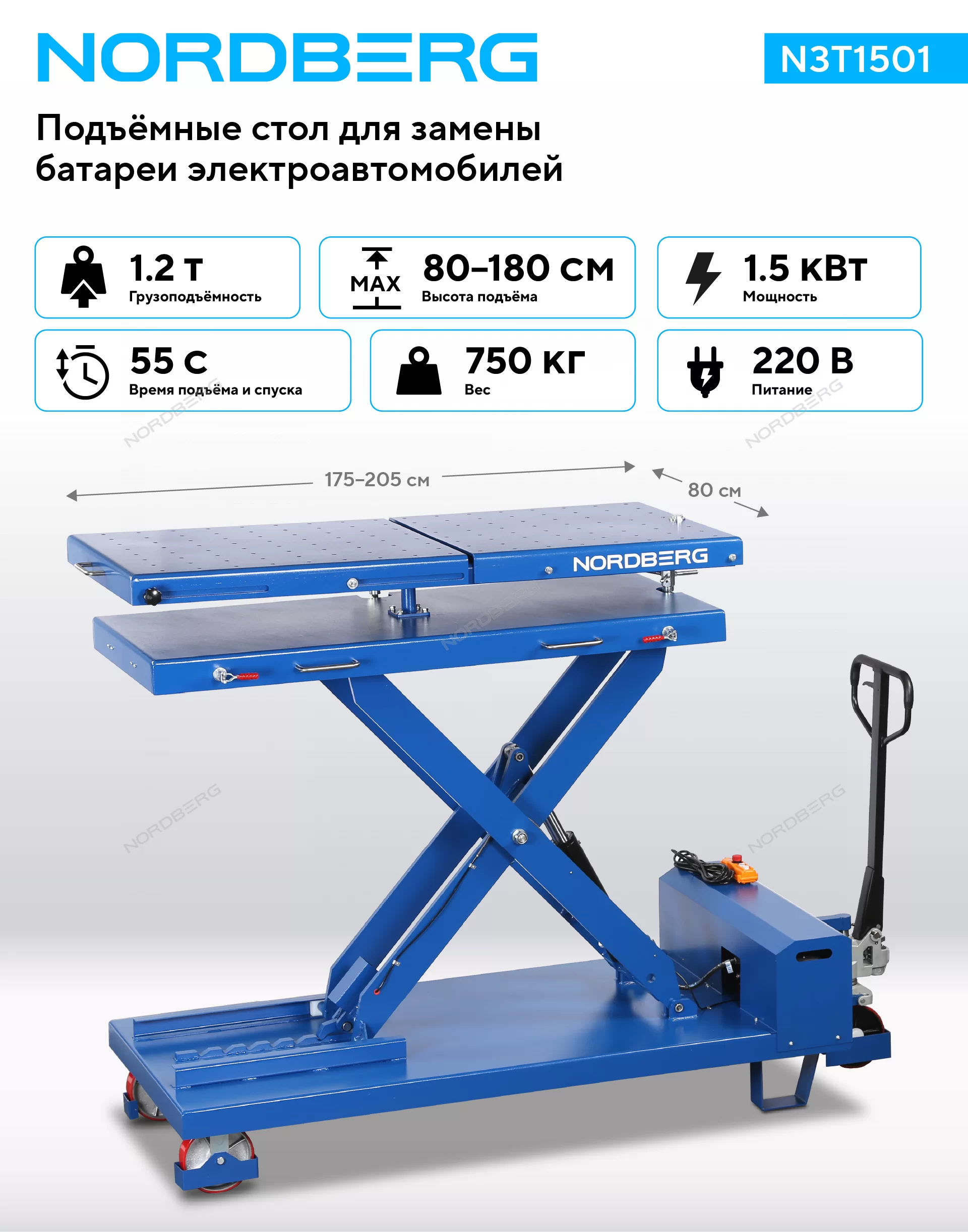 NORDBERG N3T1501 — это профессиональный подъёмный стол, сочетающий прочность, безопасность и удобство эксплуатации. Идеально подходит для сервисных центров и специализированных мастерских, работающих с электромобилями.