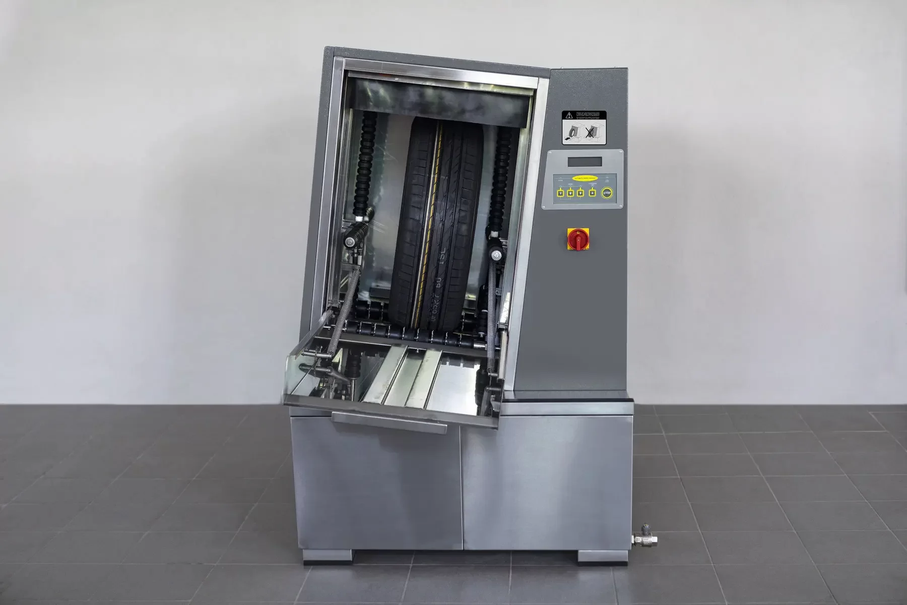 В зависимости от загрязнения колеса, оператор выбирает один из режимов мойки: - 20 секунд; - 40 секунд; - 60 секунд. Затем автоматически включается сушка колеса сжатым воздухом, которая длится 15 секунд. Также есть отдельный режим сушки колеса длительностью 30 секунд.