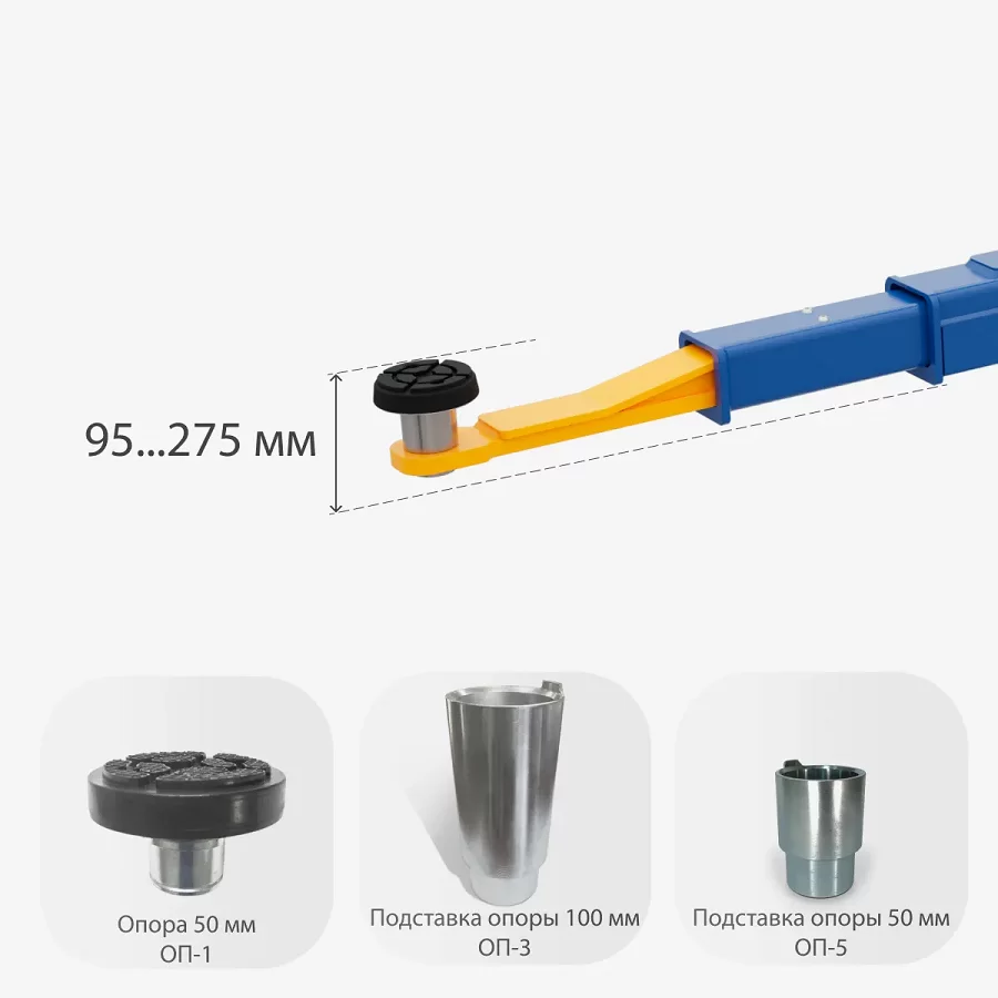 Подъемник оснащен двумя комплектами подставок 50 и 100 мм. Вы можете использовать их в любой комбинации, обеспечив высоту подхвата от 95 до 275 мм
